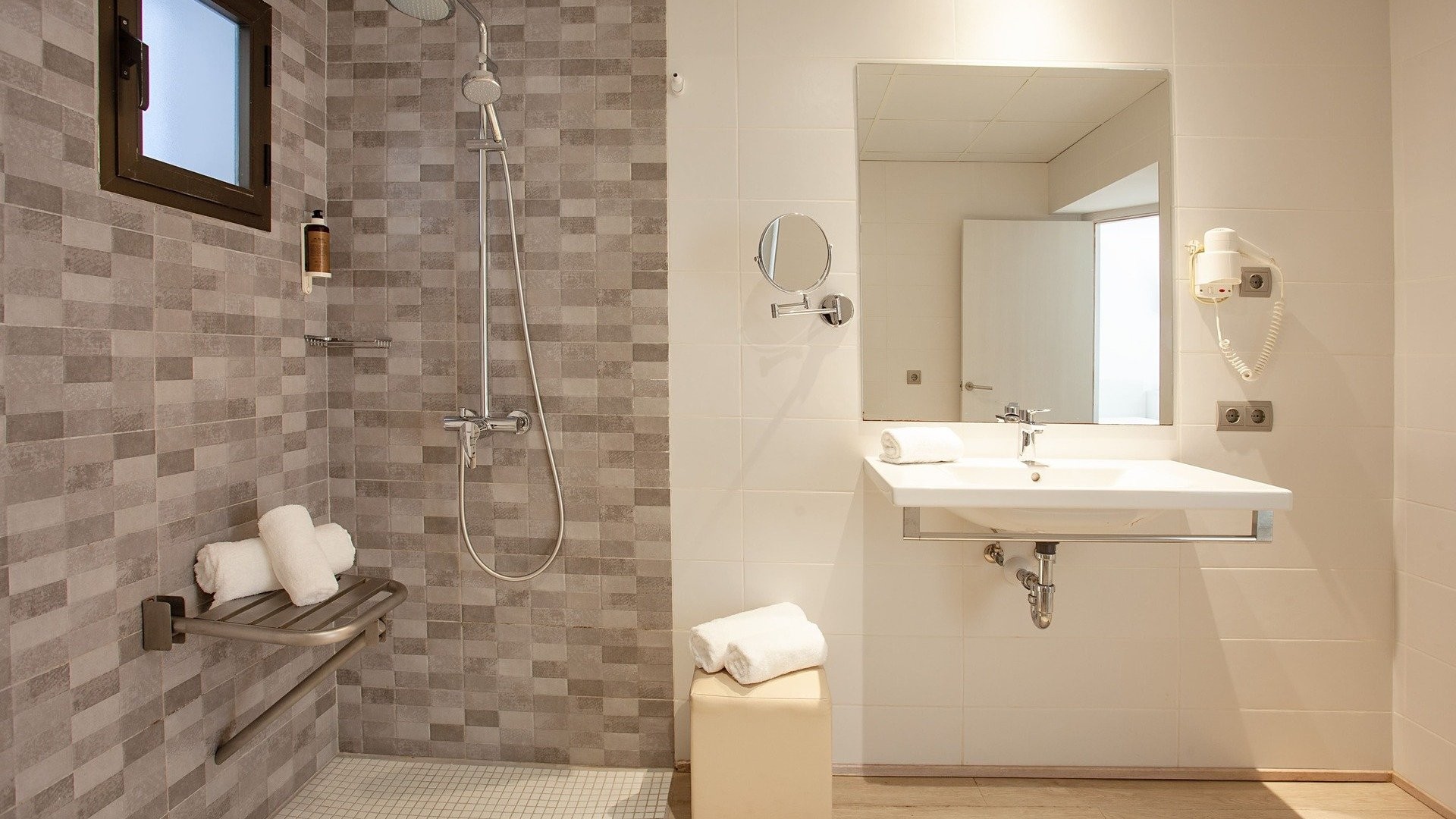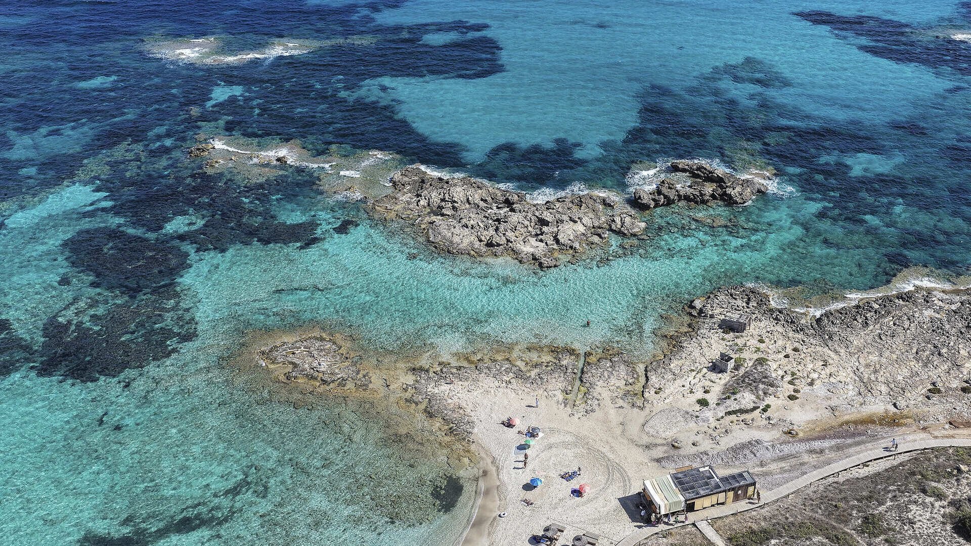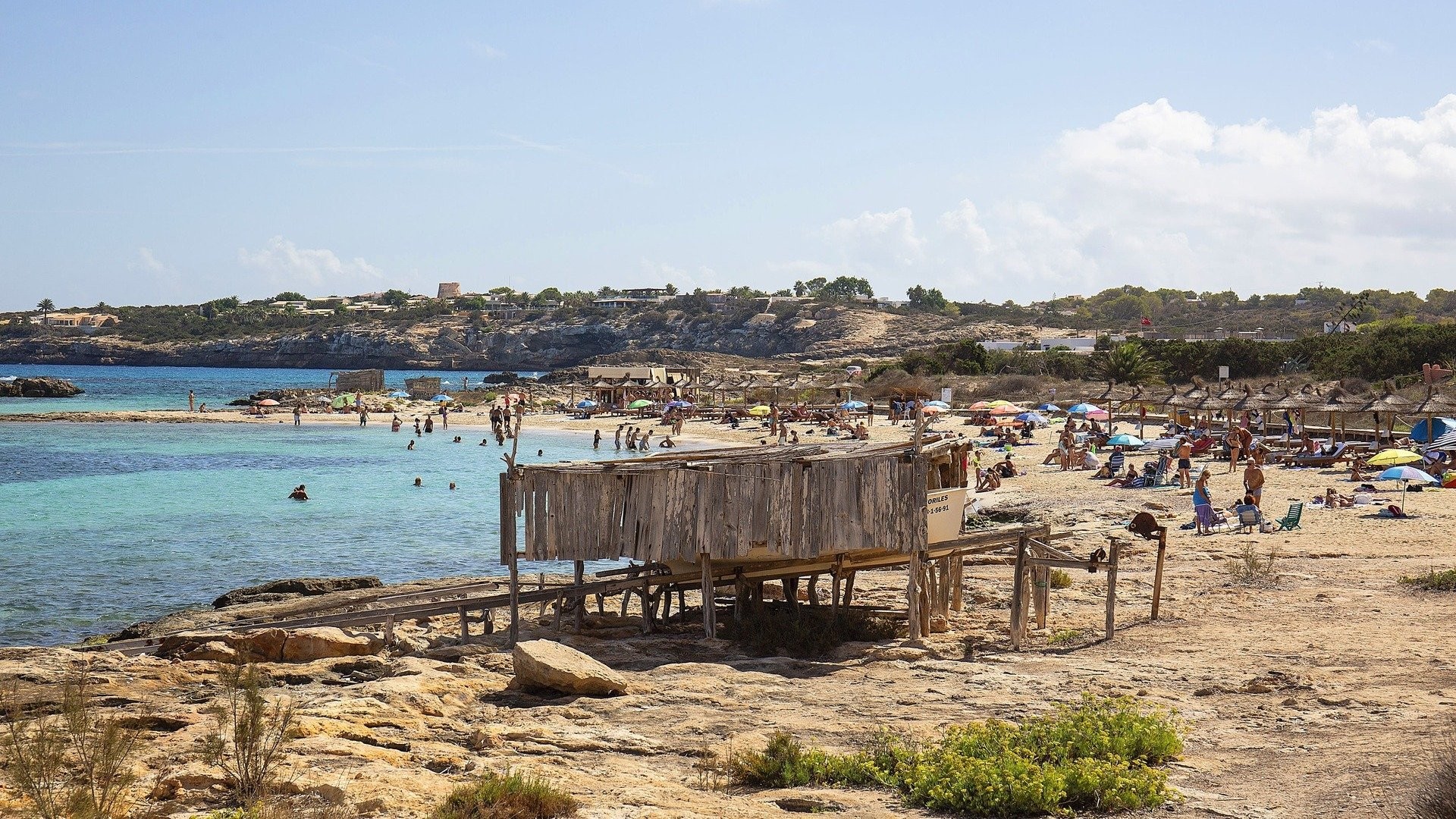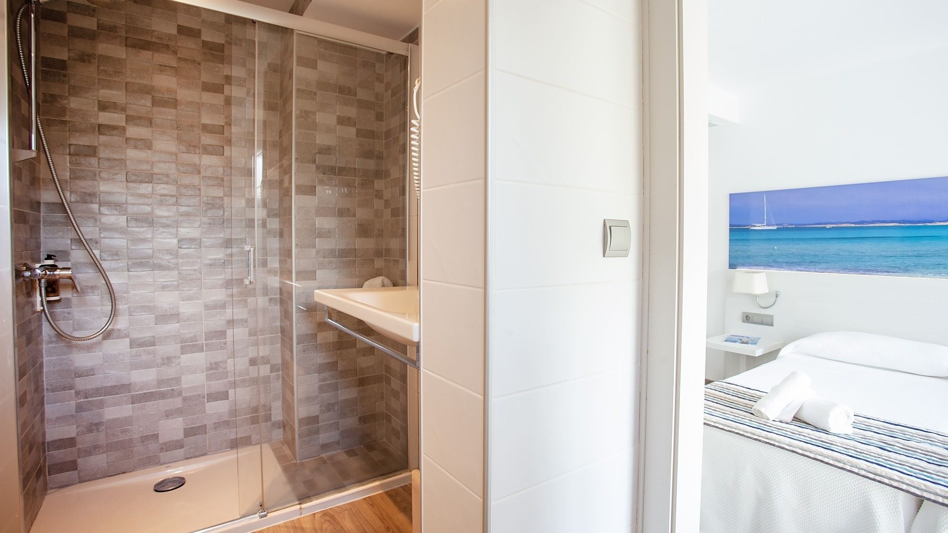 A 200 metri inizia la spiaggia di Es Pujols, di sabbia bianca, con tratti liberi e tratti attrezzati con ombrelloni e lettini a pagamento. Teli mare disponibili in reception (€ 20 deposito + €3/cambio).