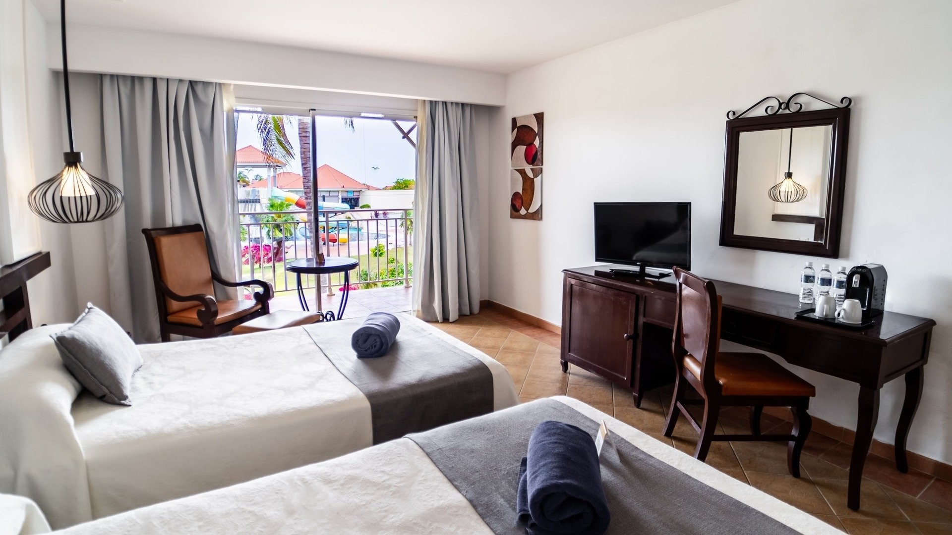 Una piscina nell’area Blu e una piscina nella sezione Musique, entrambe con ombrelloni, lettini e teli mare a disposizione. Connessione Wi-Fi nelle aree comuni di entrambi. A pagamento, servizio lavanderia, negozi di souvenir, centro spa con massaggi e trattamenti di bellezza, cambio moneta.