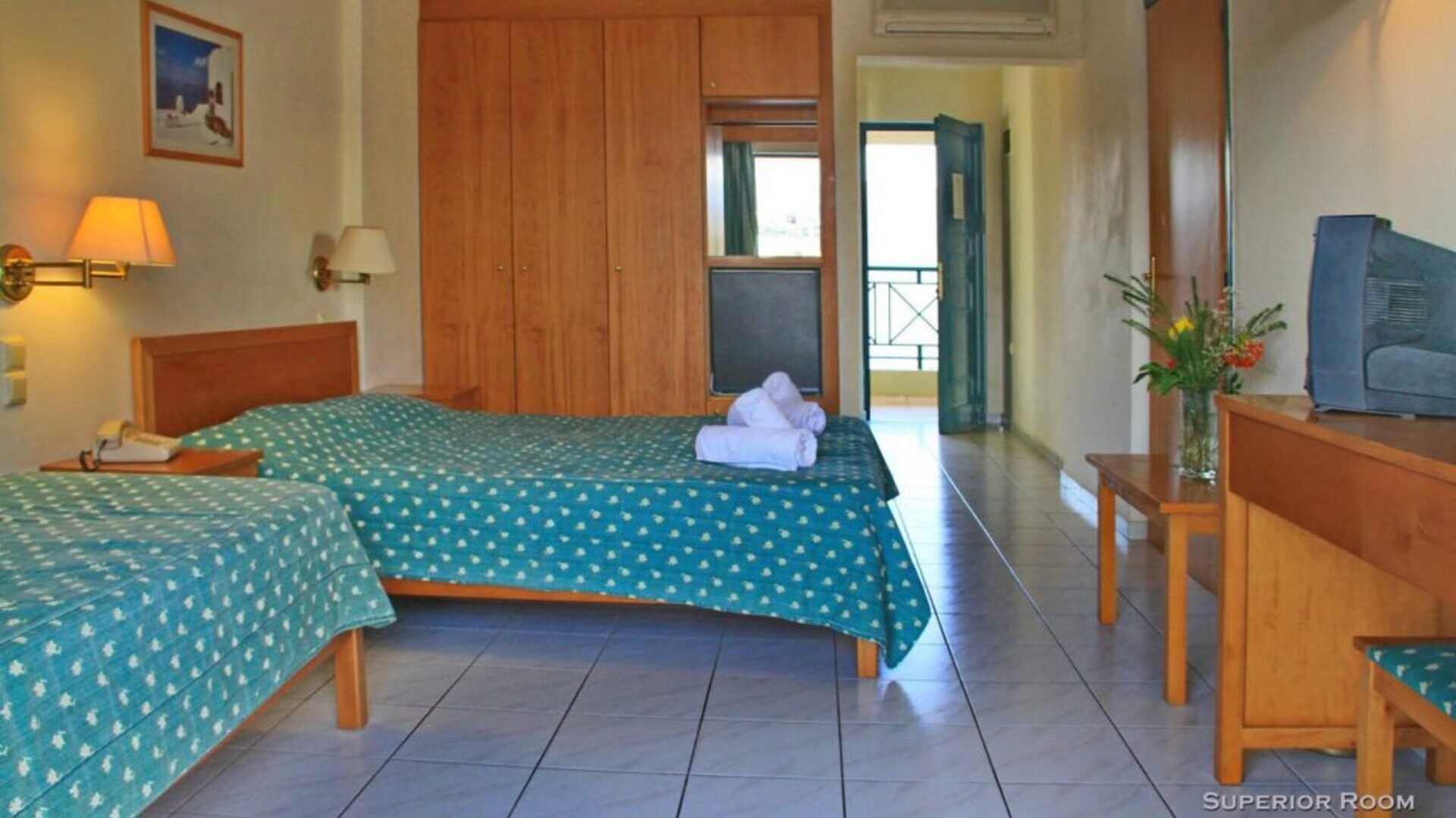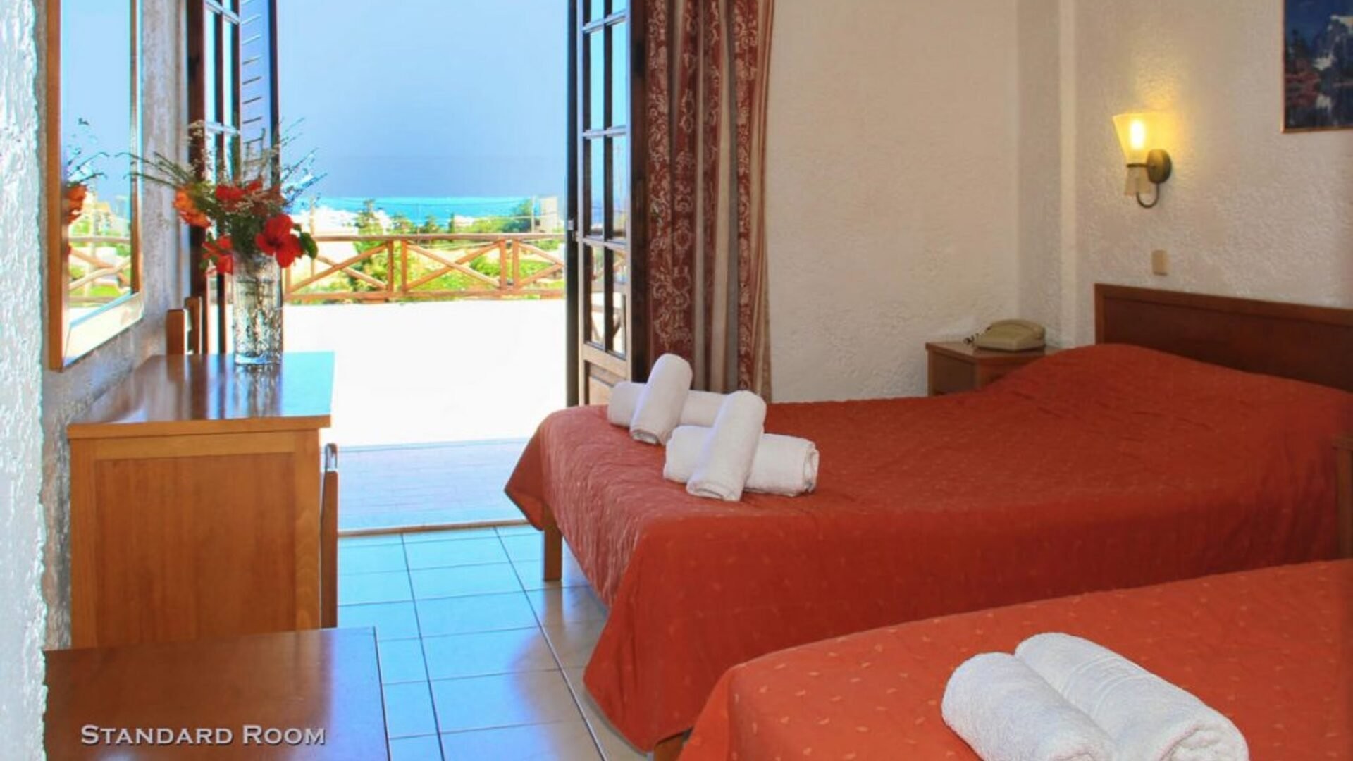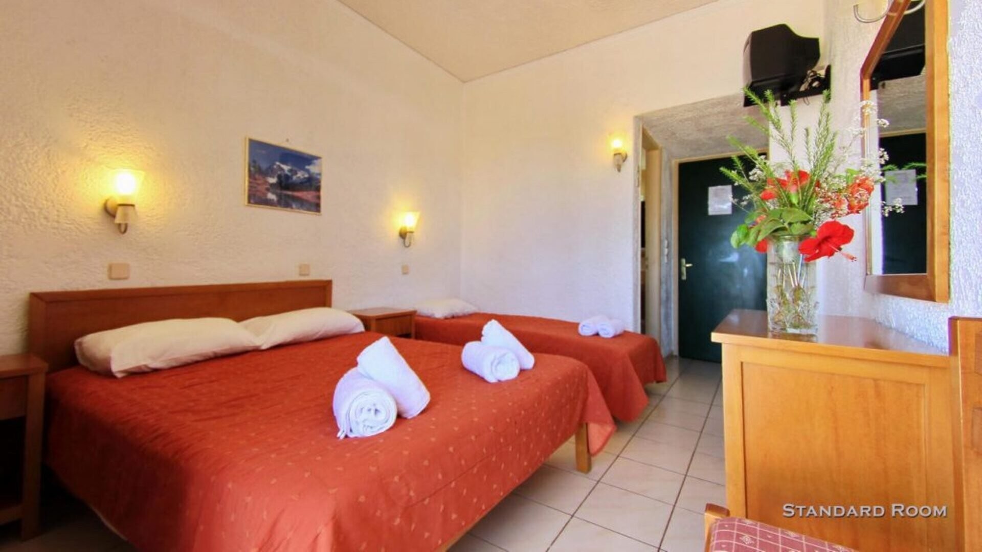 73 camere suddivise in standard (16-18 m2 – occupazione max. 3 adulti) e superior (18-22 m2 – occupazione max. 2 adulti + 2 bambini), queste ultime leggermente più grandi, parzialmente rinnovate e disponibili con supplemento. Tutte le unità sono dotate di servizi privati con asciugacapelli, connessione wi-fi gratuita, minifrigo e veranda o balcone. A pagamento, cassetta di sicurezza e aria condizionata.