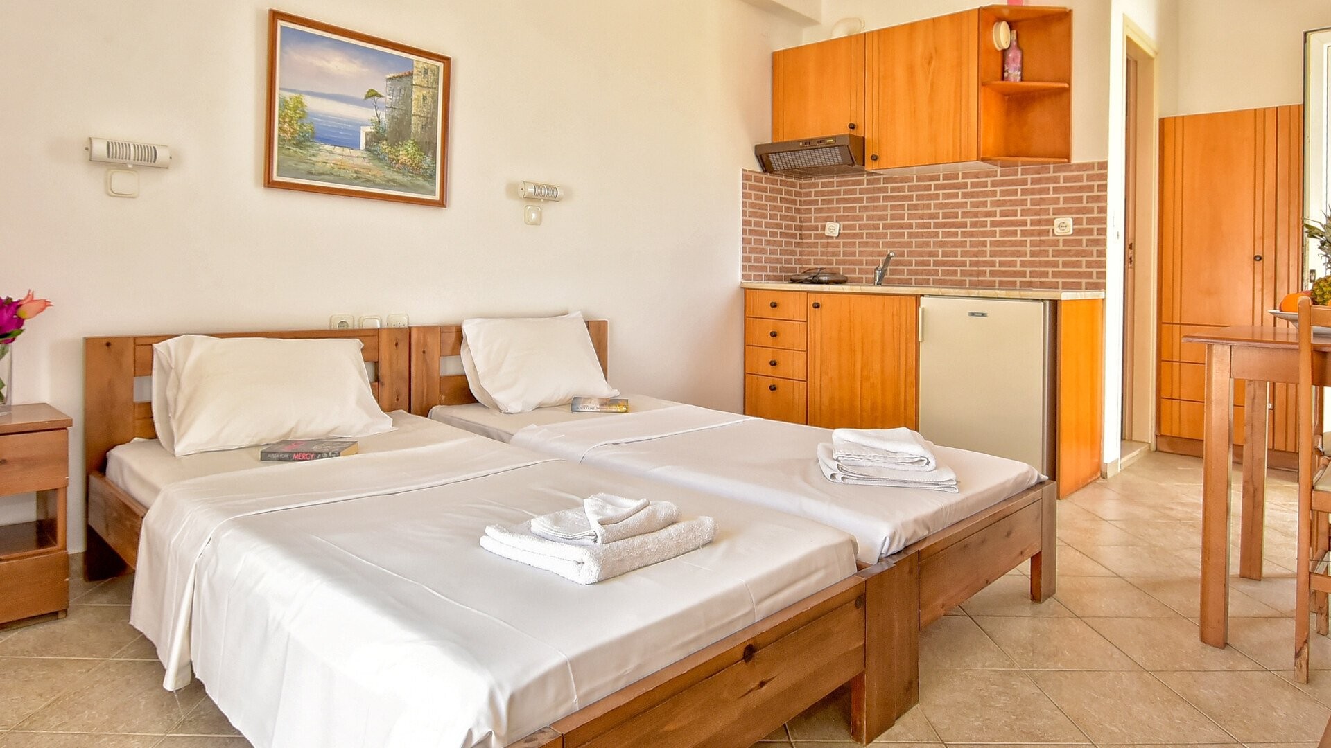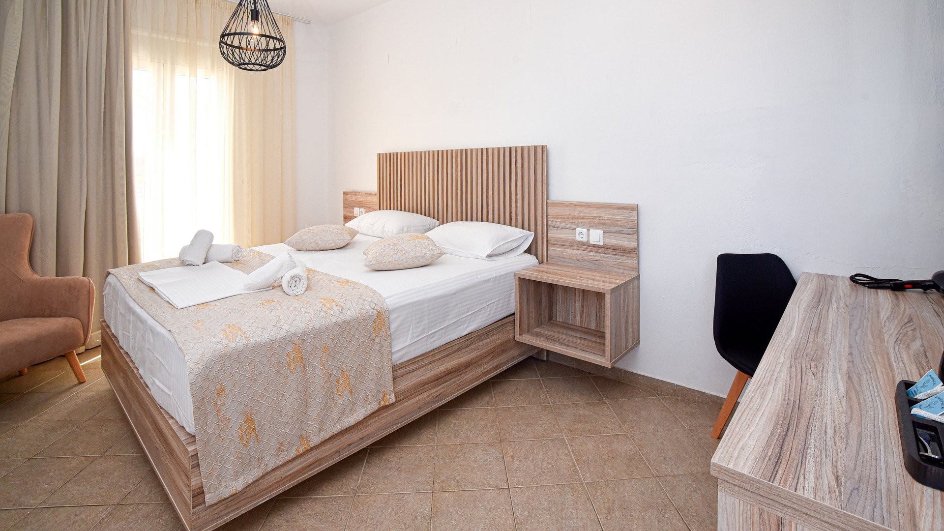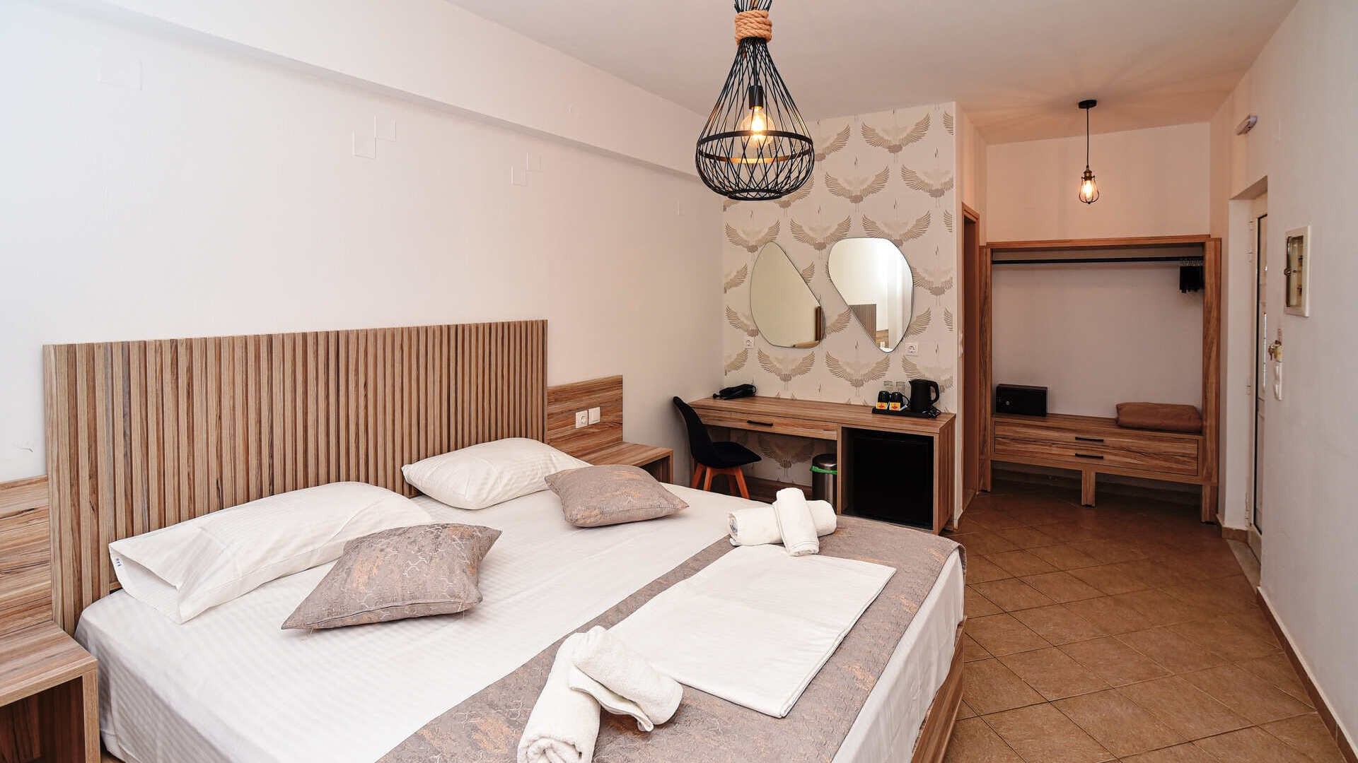 37 camere suddivise in varie tipologie, tra cui le standard vista giardino (25 m2) e, con supplemento, le superior vista giardino (25 m2) o gli appartamenti (40 m2), che possono avere vista sul giardino o vista mare e possono ospitare fino a 4 persone (2 adulti e 2 bambini). Tutte le unità dispongono di servizi privati con asciugacapelli, minifrigo, tv satellitare, bollitore per tè, cassetta di sicurezza, connessione Wi-Fi gratuita, balcone o terrazza. A pagamento, aria condizionata.