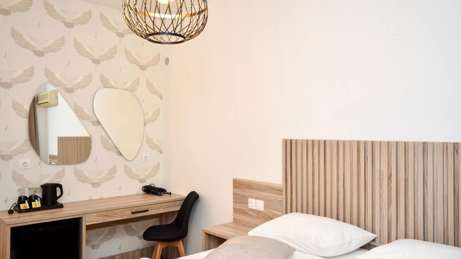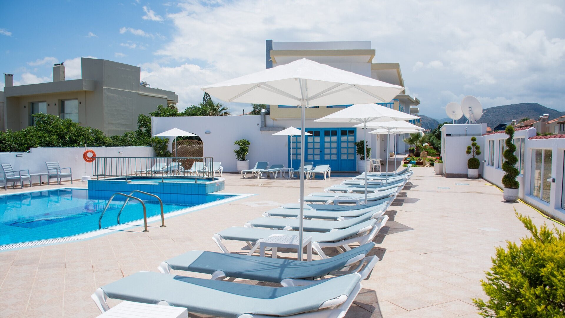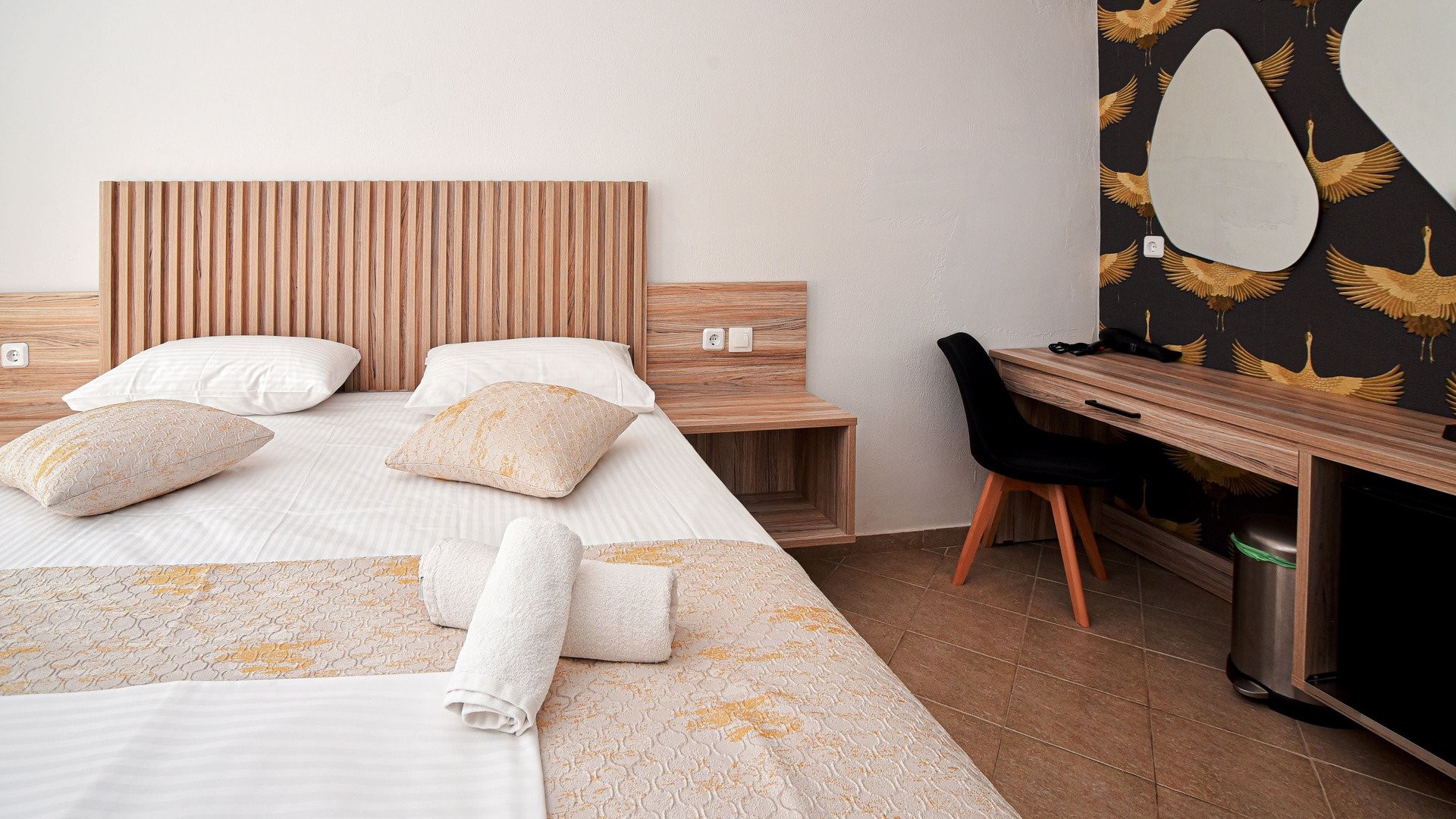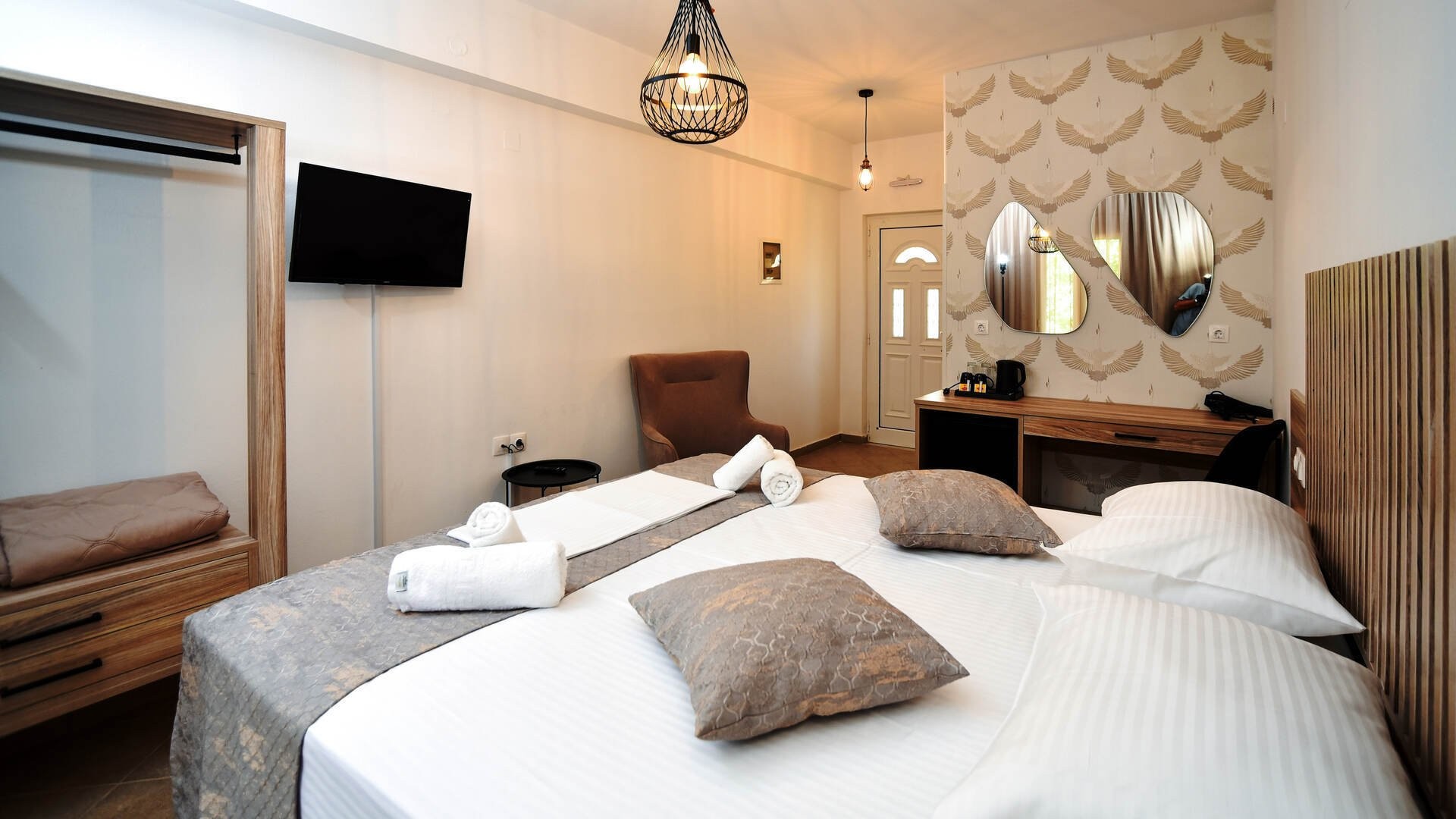 37 camere suddivise in varie tipologie, tra cui le standard vista giardino (25 m2) e, con supplemento, le superior vista giardino (25 m2) o gli appartamenti (40 m2), che possono avere vista sul giardino o vista mare e possono ospitare fino a 4 persone (2 adulti e 2 bambini). Tutte le unità dispongono di servizi privati con asciugacapelli, minifrigo, tv satellitare, bollitore per tè, cassetta di sicurezza, connessione Wi-Fi gratuita, balcone o terrazza. A pagamento, aria condizionata.