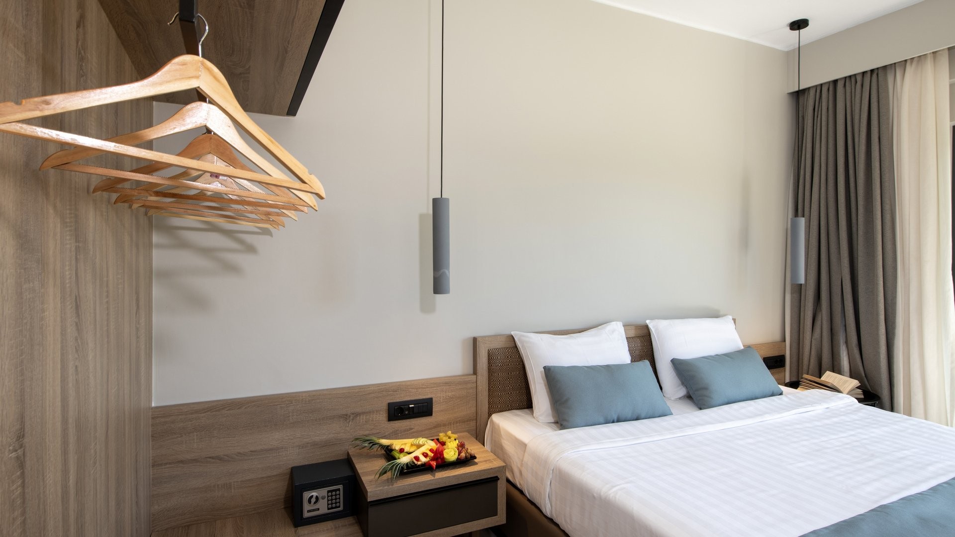 40 camere totali tra cui: le Twin vista giardino e, con supplemento, vista mare, entrambe di 19 mq e con occupazione max 2 adulti. Si arriva infine alla tipologia Family Room di 24 mq e con occupazione max 3. Tutte le camere dispongono di aria condizionata, connessione wi-fi gratuita, tv, asciugacapelli, cassetta di sicurezza (a pagamento) e mini-frigo.