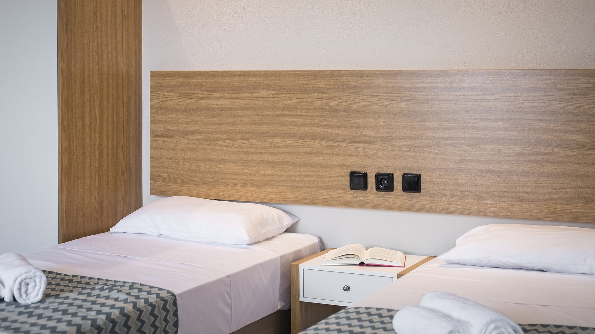 100 camere fra le quali distinguiamo le Superior (19 mq con occupazione max 2+1) e le più spaziose Superior Family (34 mq con occupazione max 3+1). Tutte le camere dispongono di aria condizionata, connessione wi-fi, tv, asciugacapelli, balcone. A pagamento, cassetta di sicurezza e mini bar.