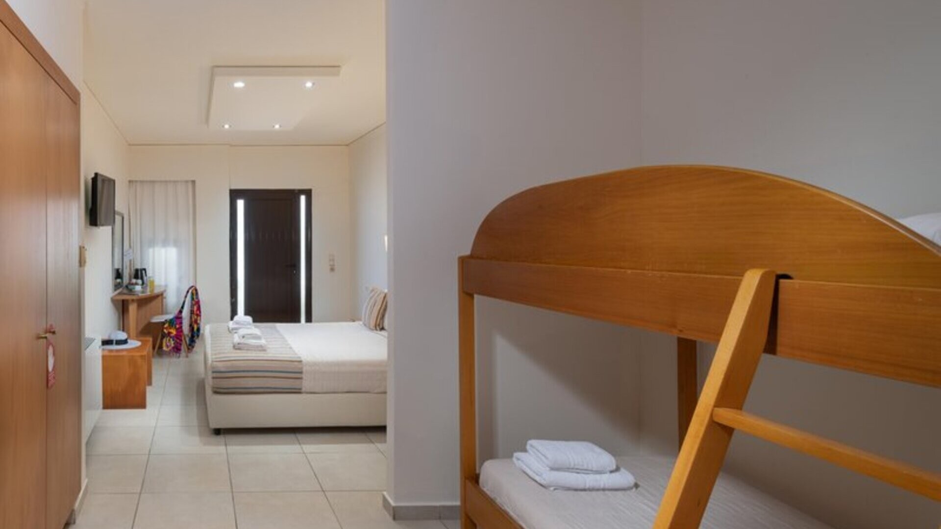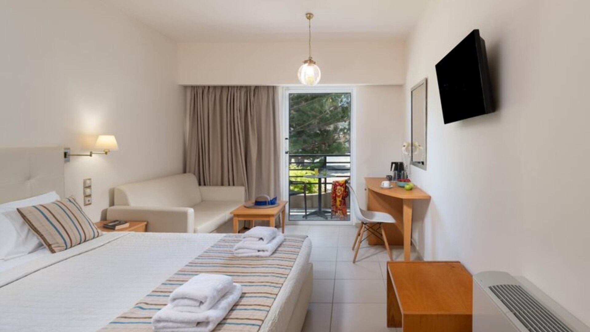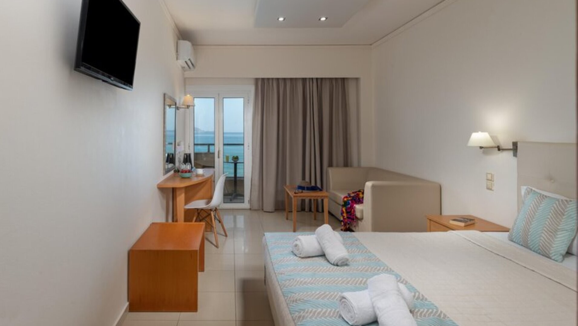 158 camere, la maggior parte di queste di tipologia standard (22 m²) e camere family leggermente più spaziose rispetto alle prime (26 m²). Disponibili, inoltre con supplemento, le camere vista mare della stessa metratura delle standard. Le camere dispongono servizi privati, asciugacapelli, aria condizionata, tv satellitare con alcuni canali italiani, minifrigo, connessione Wi-Fi gratuita e terrazza o balcone. A pagamento, cassetta di sicurezza.