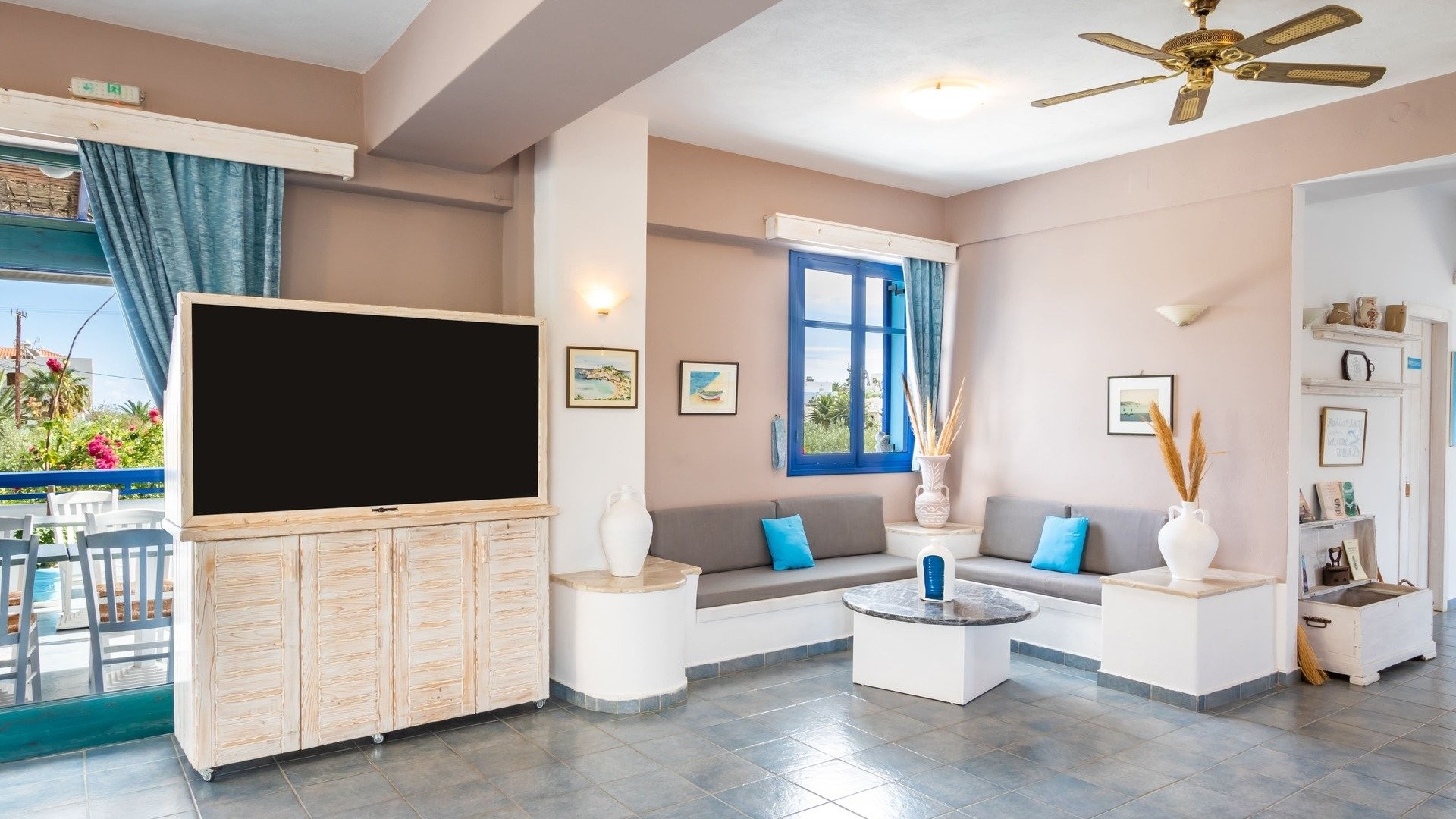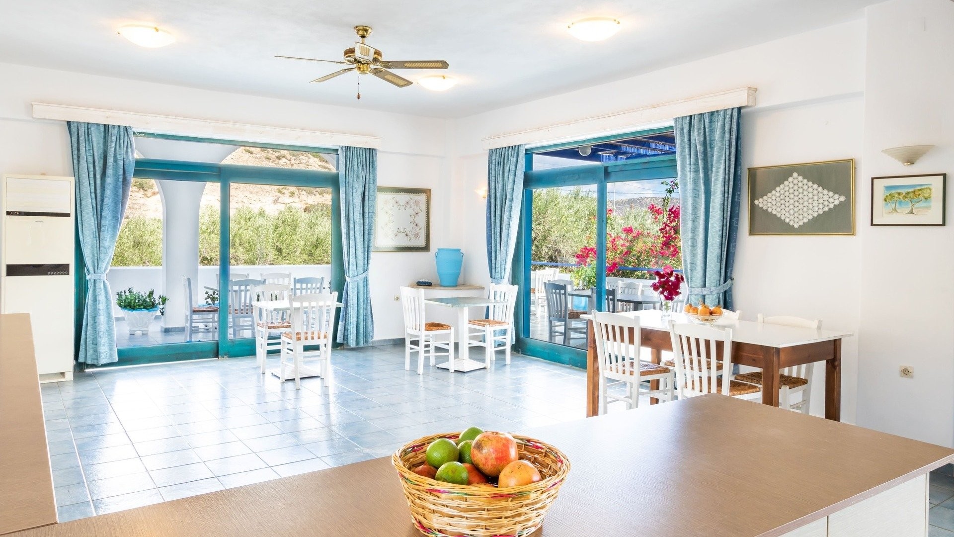1 sala colazioni ed 1 bar. È disponibile, inoltre, il supplemento pranzo o cena in ristoranti convenzionati: acquistando tale supplemento, avrete a disposizione tanti pasti quante sono le notti di soggiorno spendibili liberamente per pranzo o cena, anche 2 nello stesso giorno, presso i ristoranti convenzionati Taverna Pigadia (aperta a pranzo e cena) e Anemousa Restaurant (aperto solo per cena, con arrivo entro le 19:45 max) a Pigadia. Il menù, in entrambi i casi, prevede 1 antipasto (a scelta tra 2 opzioni), 1 piatto principale (a scelta tra 2 opzioni), 1 dessert (dolce o frutta), 1 bicchiere di acqua e 1 di vino della casa.