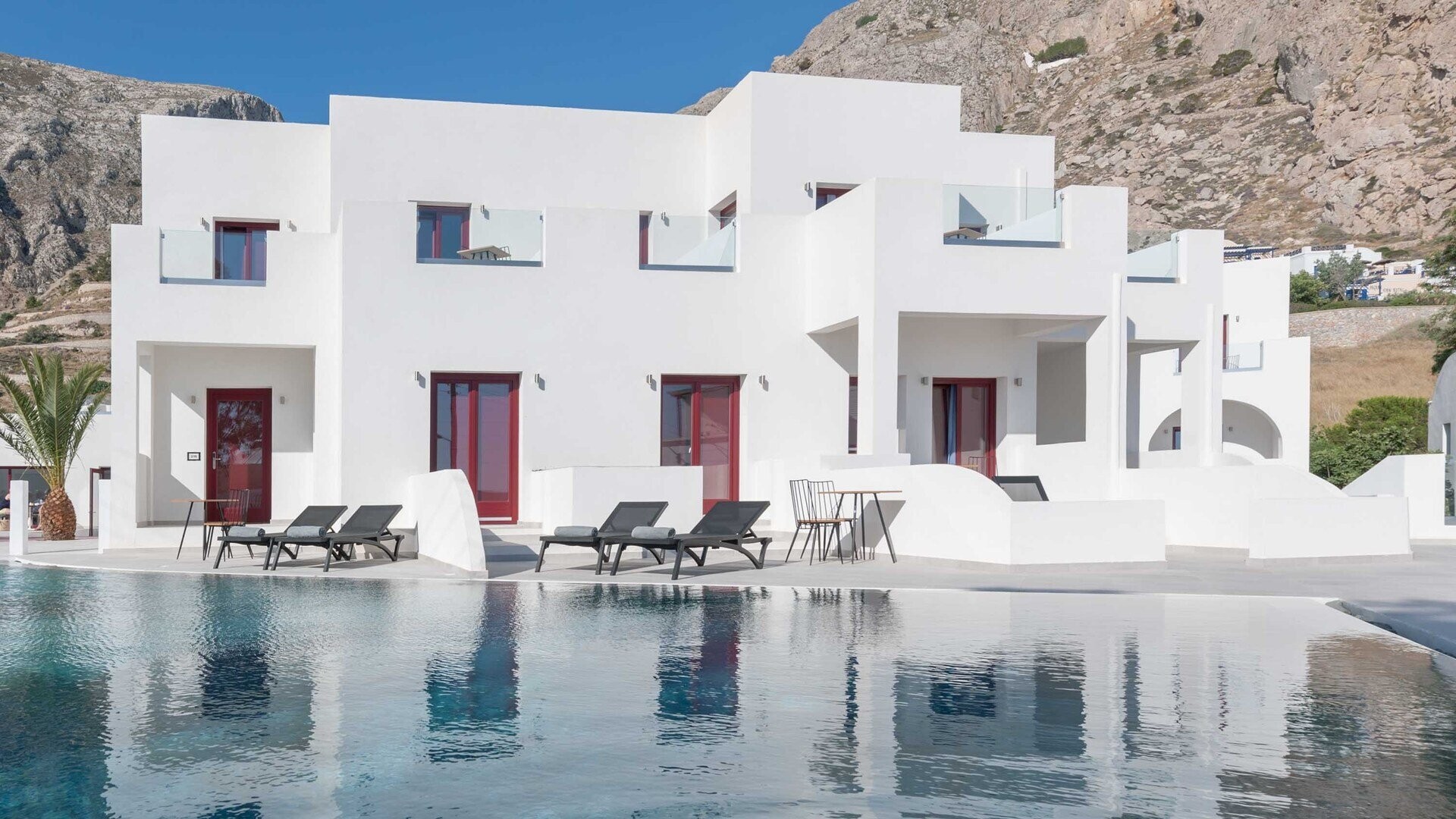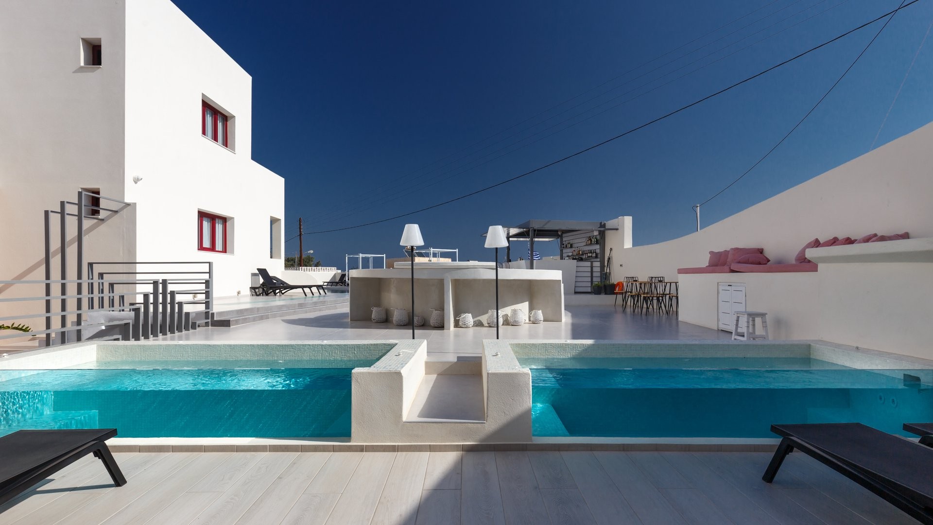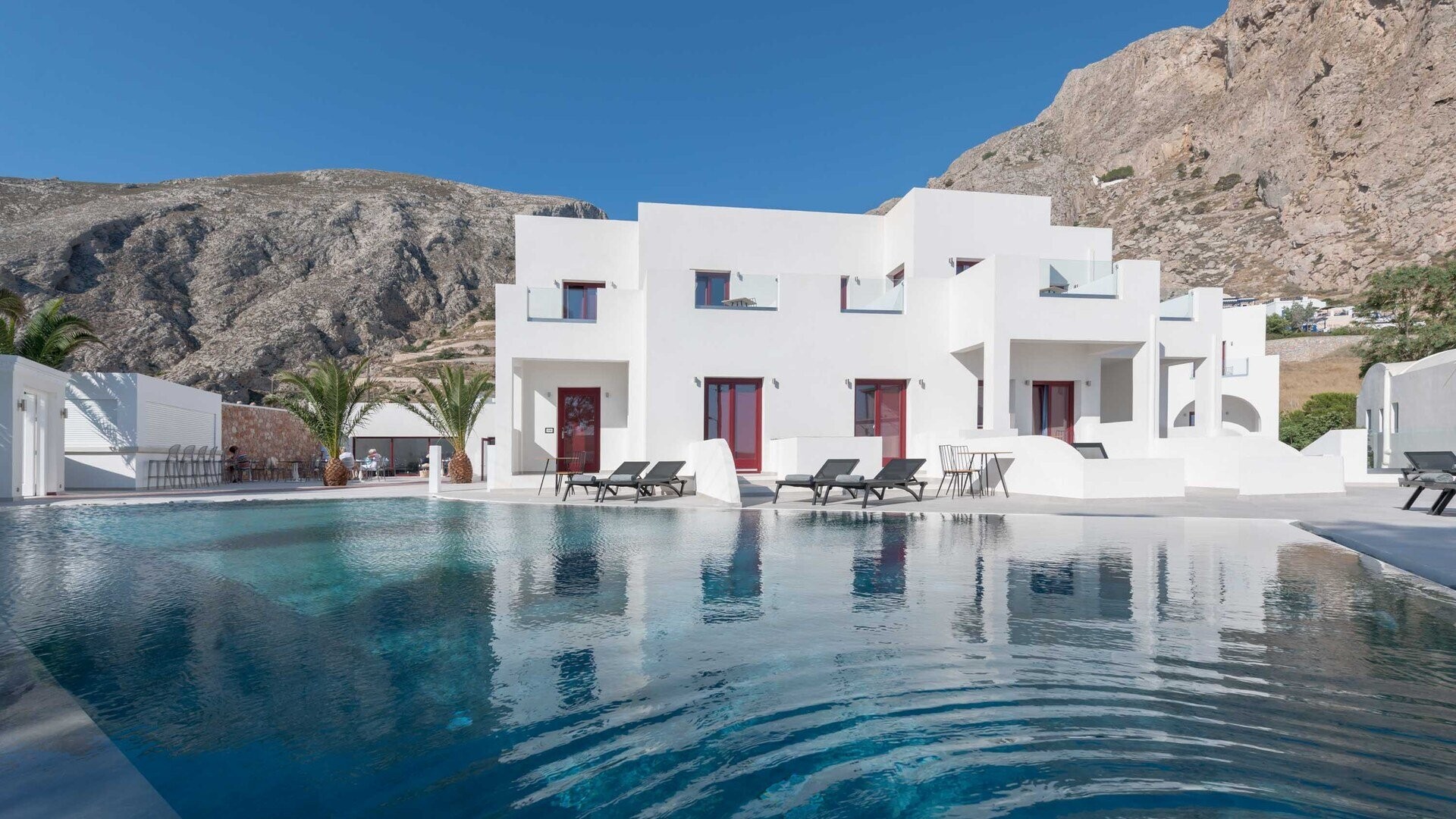 Elegante 4 stelle a Kamari dallo stile moderno e mediterraneo. Vicino alla spiaggia nera, offre una piscina relax e facile accesso alla vita serale e a Thira. Perfetto per vivere il mare e l'essenza dell’isola.