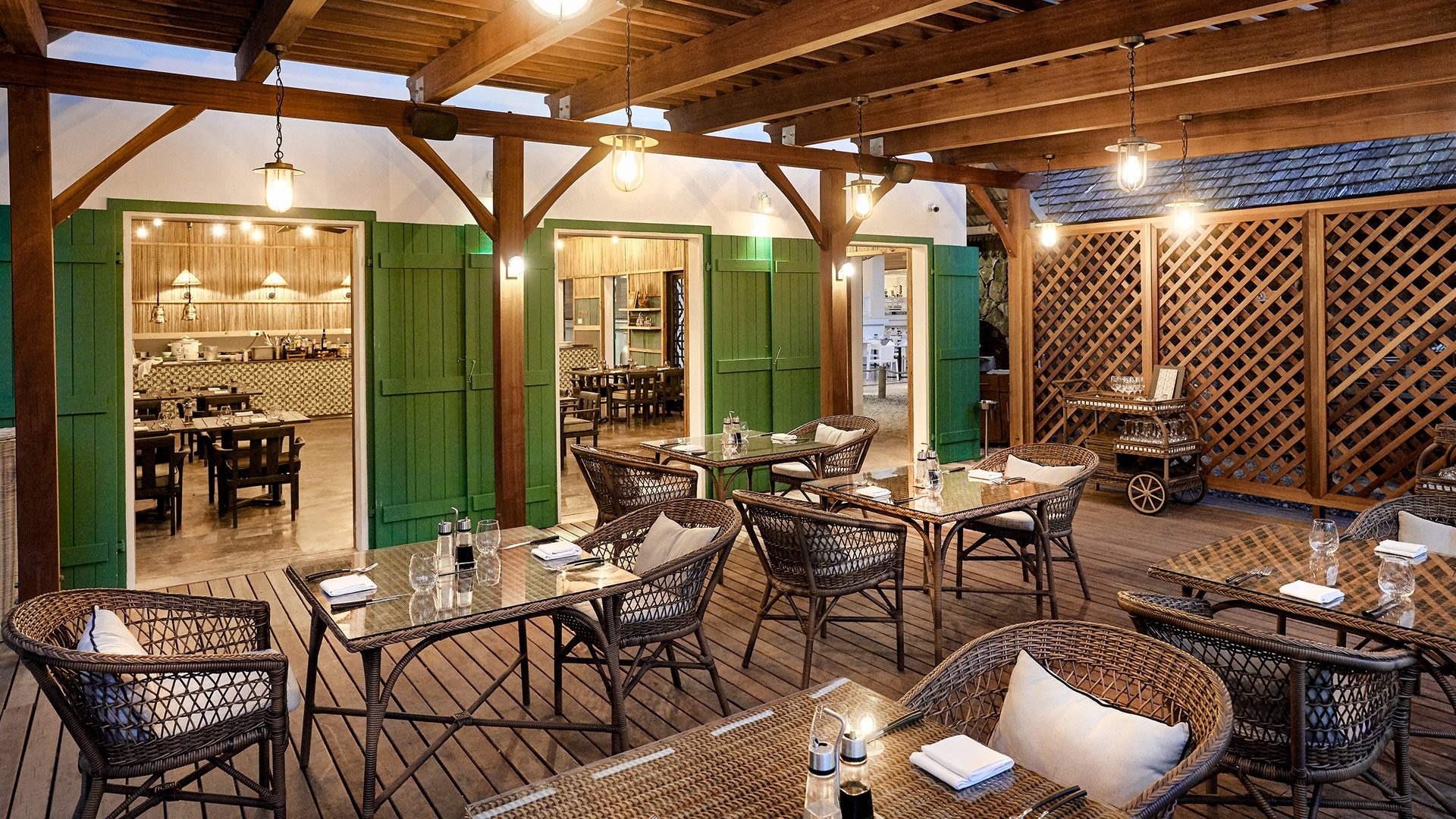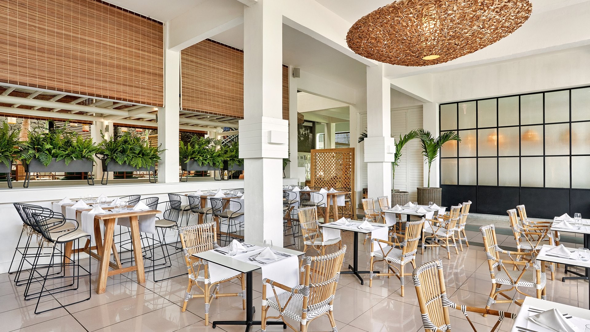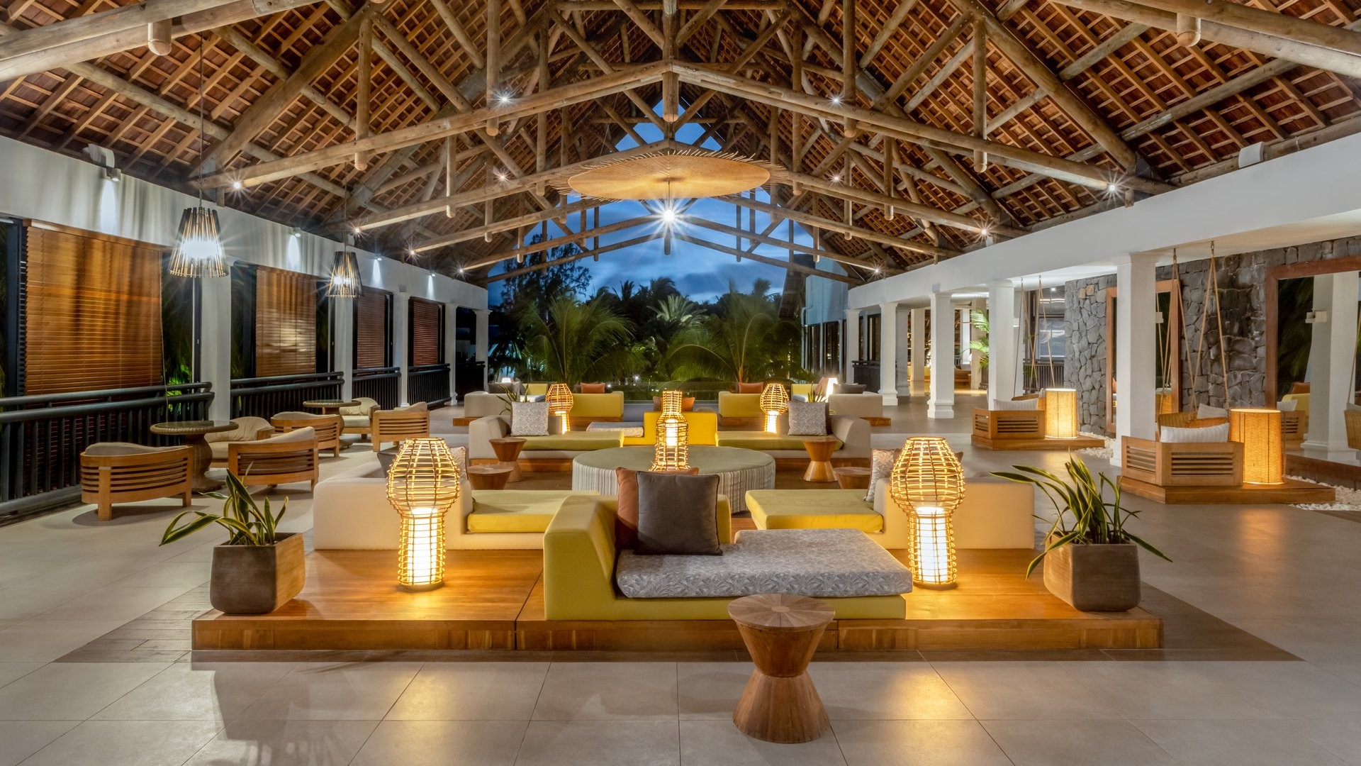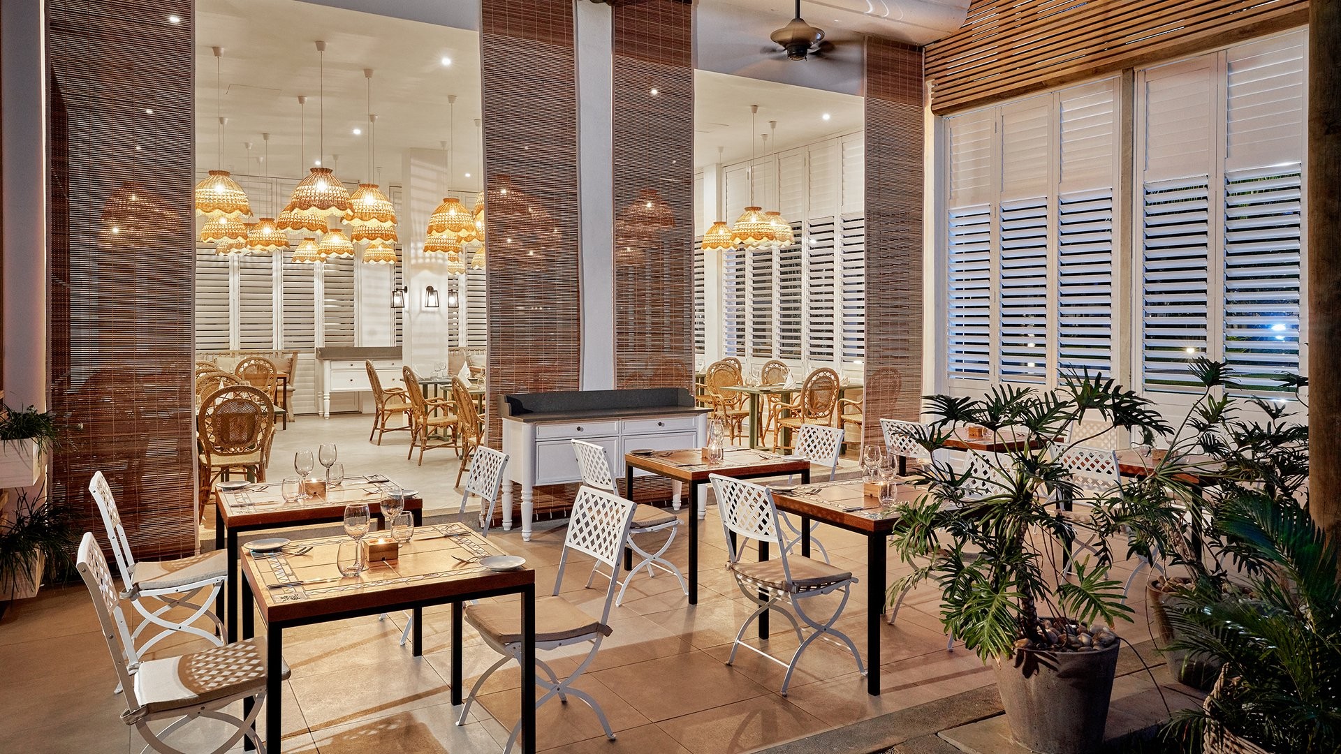 9 ristoranti, di cui il principale a buffet Mozaik, e 8 ristoranti à la carte, The Bistrot con insalate, hamburger e gastronomia varia, Ō con specialità mediterranee e Taba-j di street food mauriziano (aperti per pranzo e cena gratuitamente, Taba J solo pranzo); Madame Ming di cucina asiatica, A Tavola!, italiano, e Kot Nou con cucina locale gourmet (aperti solo a cena gratuitamente). Riviera con specialità di frutti di mare e Lime di cucina giapponese sono invece a pagamento per soli adulti e aperti solo per cena. 6 bar, Ō Beach Bar, Balcony Bar, Pool Bar, The Bistrot, Sky Bar e un disco bar, After, che apre dalle 23 in poi. I clienti potranno usufruire della formula di mezza pensione libera che consentirà di avere tanti pasti quante sono le notti di soggiorno, anche due nello stesso giorno, avvisando la reception 48 ore prima.