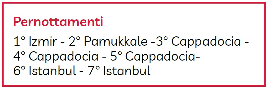 Arrivo ad Izmir (con scalo a Istanbul) ed accoglienza in aeroporto. Trasferimento, sistemazione in hotel, cena libera. Si consiglia una passeggiata ad Izmir, la terza città della Turchia per grandezza e numero di abitanti, in particolare lungo il Kordon, il suo vivacissimo lungomare brulicante di ristoranti e locali dove magari fermarvi per cena.